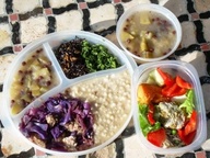 Una sopa de mijo o de verduras con algas y salsa de soyaUn plato combinado de arroz integral hervido con alga kombu y proteína vegetal (legumbres, seitan o gluten de trigo, tofu o queso de soya, tempeh o soya fermentada)